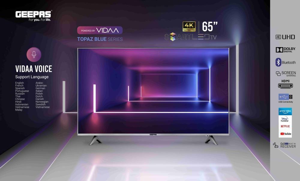شاشة جيباس 65 بوصة ويب أو إس: تلفزيون ذكي يعمل بنظام WebOS، دقة 4K UHD، دعم HDR، تحكم ذكي، تجربة صوت وصورة غامرة، تصميم أنيق، منافذ متعددة، ضمان سنتين.